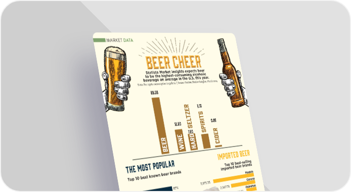 MARKET DATA BBEEREER C CHHEEREER Statista Market Insights expects beer to be the highest-consuming alcoholic beverage on average in the U.S. this year. Note: Per capita consumption in gallons | Source: Statista Market Insights, March 2024 69.39 tzer 6.15 12.80 sel 0.95 7.80 spirits beer wine Hard cider THE MOST POPULAR IMPORTED BEER Top 10 best known beer brands Top 10 best-selling imported beer brands Modelo Bud Light 87% 3,973.33 Corona Corona 87% 2,967.78 Heineken Budweiser 85% 829.29 Dos Equis XX Heineken 85% 430,68 Stella Artois Miller 80% 401.57 Pacífico Coors 79% 271.48 Guinness Michelob 77% 170.97 Labatt Busch 76% 147.47 Tecate Blue Moon 74% 125.35 Foster’s Samuel Adams 73% 78.59 Note: United States; August 2023; 1,152 individuals aged 21-64 Note: Sales 昀椀gures in millions of dollars for top imported beer brands to the answered the online survey. U.S. in 2022. Source: Statista with information from Beverage Industry Magazine, Source: Statista with information from Beer Brands Ranked. March 2023. 1414 JJUULLYY//AAUUGGUUSST 2T 200224 4 AABBAASSTOTO..CCOOMM