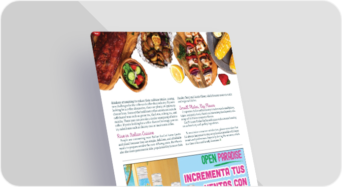 drinkers attempting to reduce their ca昀昀eine intake, posing Stanley Tucci and Jamie Oliver, which focuses more on rustic new challenges for the co昀昀ee and co昀昀ee shop industry. If you're and regional dishes. looking for a co昀昀ee alternative, there are plenty of options to choose from. Some of the healthiest co昀昀ee substitutes include Small Plates, Big Flavor ca昀昀einated teas such as green tea, black tea, oolong tea, and Croquettes: In line with industry trends towards small plates, matcha. 吀栀ese teas can provide a similar energizing e昀昀ect to tapas, and party food, there's an interesting development of a co昀昀ee. If you're looking for a co昀昀ee-昀氀avored beverage, you can range of delicious croquette 昀氀avors. try substitutes such as chicory root or mushroom co昀昀ee. Cod Fritters: Under the Spanish tapas style concept focusing Rise in Italian Cuisine on authenticity and quality ingredients. People are consuming more Italian food at home (pasta To maximize consumer satisfaction, please remember that and pizza) because they are simple, delicious, and a昀昀ordable it's always important to stay as updated as possible with buyer meals to prepare amidst the cost of living crisis. But there's trends and preferences. Especially during the summer, which also the more gastronomic side, popularized by famous chefs is a time of fun and family closeness. AABBAASSTOTO..CCOOMM MMAAYY/J/JUUNNEE 2 2002244 7575