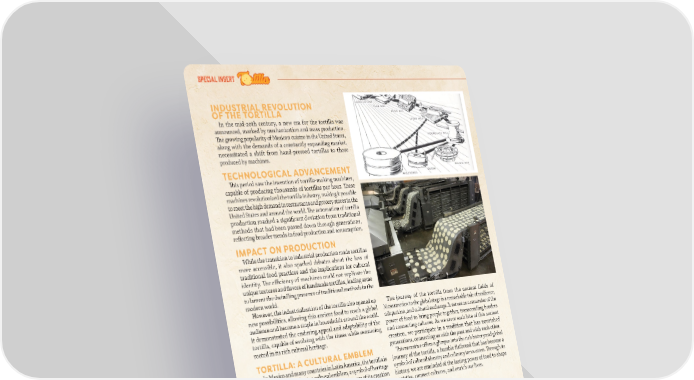 special insert INDUSTRIAL REVOLUTION OF THE TORTILLA In the mid-20th century, a new era for the tortilla was announced, marked by mechanization and mass production. 吀栀e growing popularity of Mexican cuisine in the United States, along with the demands of a constantly expanding market, necessitated a shift from hand-pressed tortillas to those produced by machines. TECHNOLOGICAL ADVANCEMENT 吀栀is period saw the invention of tortilla-making machines, capable of producing thousands of tortillas per hour. 吀栀ese machines revolutionized the tortilla industry, making it possible to meet the high demand in restaurants and grocery stores in the United States and around the world. 吀栀e automation of tortilla production marked a signi昀椀cant deviation from traditional methods that had been passed down through generations, re昀氀ecting broader trends in food production and consumption. IMPACT ON PRODUCTION While the transition to industrial production made tortillas more accessible, it also sparked debates about the loss of traditional food practices and the implications for cultural identity. 吀栀e e昀케ciency of machines could not replicate the unique textures and 昀氀avors of handmade tortillas, leading some to lament the dwindling presence of traditional methods in the modern world. However, the industrialization of the tortilla also opened up The journey of the tortilla from the ancient fields of new possibilities, allowing this ancient food to reach a global Mesoamerica to the global stage is a remarkable tale of resilience, audience and become a staple in households around the world. adaptation, and cultural exchange. It serves as a reminder of the It demonstrated the enduring appeal and adaptability of the power of food to bring people together, transcending borders tortilla, capable of evolving with the times while remaining and connecting cultures. As we savor each bite of this ancient rooted in its rich cultural heritage. creation, we participate in a tradition that has nourished generations, connecting us with the past and with each other. TORTILLA: A CULTURAL EMBLEM 吀栀is narrative o昀昀ers a glimpse into the rich history and global In Mexico and many countries in Latin America, the tortilla is journey of the tortilla, a humble 昀氀atbread that has become a more than just food; it is a cultural emblem, a symbol of heritage symbol of cultural identity and culinary innovation. 吀栀rough its and home. Its simple ingredients and the process of its creation history, we are reminded of the lasting power of food to shape tell a story of resilience, community, and innovation. societies, connect cultures, and enrich our lives. MORE THAN FOOD The importance of the tortilla extends far beyond its nutritional value. It embodies the spirit of Mexican cuisine, known for its rich 昀氀avors, diverse ingredients, and deep cultural roots. Whether served alongside a hearty stew, wrapped around succulent meats, or simply enjoyed with a dollop of salsa, the tortilla remains a fundamental part of Mexican culinary tradition. CONTEMPORARY CELEBRATIONS Today, the tortilla continues to be celebrated in its many forms, from the traditional corn tortilla, redolent with the 昀氀avor of nixtamalized corn, to the soft and 昀氀exible 昀氀our tortilla. It is a testament to the versatility of the tortilla that it can be found at the heart of so many dishes, from tacos and burritos to enchiladas and beyond. 1144 MMAAYY//JJUUNNE 2E 20 02244 - - A ABBA ASSTTOO..CCOOMM