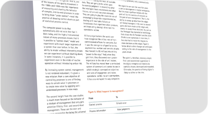 From Looking Digital to Being Digital: The Impact of Technology on the Future of Work At one level, there’s nothing especially Why focus on first- and second-level like Rio Tinto look at command and control. new in this insight. We’ve known for a management? Their jobs are likely to Recall that the head of innovation and long time that delegation is essential to change the most in the transition to being technology at Rio Tinto described the role managers’ ability to oversee larger numbers digital. They will need to be both literate of remote data centers as an advisory one of people and more complex processes. and numerate if they are going to support for mining operations, not a command role. However, there’s a dimension here that employees in making the most of available goes beyond simple delegation. That is, one data. They are going to be called upon We expect to see over the next five years of the lessons of the quality movement in to exercise judgment in reconciling what a similar development in digital enterprises. the 1980s and 1990s was the importance the intelligent tools recommend and what But the most significant break with the of measuring and charting the behavior history, culture and customers demand. past will be the exercise of restraint on of complex, end-to-end processes in order They are going to play the essential role of the part of core management. That is, the to bring them “under control”—recall the encouraging responsible experimentation, ability to scoop up data from the edges practice of drawing control charts as part dealing with inevitable failures or will tempt managers in the core to second- of statistical process control. breakdowns that experimentation produces, guess decisions made at the edges and, and translating strategic direction into worse, to usurp those decisions. So, just as The computer power to do that operational action. the Pentagon has marveled at technology automatically did not exist then but it that allows the US President and the Joint does today, and the highly instrumented Military organizations the world over Chiefs to see operations in real-time, it nature of many processes means that it have recognized the critical role of non- has also had to resist the impulse to is possible to “control chart,” model and commissioned officers for centuries. But make decisions at the edges. Figure 5 experiment with much larger segments of it was the emergence of guerilla tactics, below details other changes we anticipate a system than ever before. In fact, the asymmetrical warfare and terrorist attacks seeing in the role of management in the ability to model without intervening means that forced the US military into driving years ahead. we can experiment without shutting down; “power to the edge.” And, when they in some instances, it is possible to got there, they discovered even greater The point is, therefore, relatively simple: experiment even in the midst of routine importance in the role of unit leaders. first- and second-level supervision in operation without introducing undue risk. The military has moved from a centralized the digital enterprise will need to be system of command and control to one in carefully chosen, developed and rewarded. By increasing system control, management which strategic command set objectives Otherwise, the promise of being digital is is not rendered redundant; it’s given a and rules of engagement and leaves likely to wither on the vine. new mission: from a core objective of operational control to unit commanders. controlling processes to one of finding It has also reshaped the way companies ways to unlock value in processes or to create new value by applying well- understood processes in new ways. Figure 5: What happens to management? The second insight from the case studies is much more focused on the behavior of From To a stratum of management that only gets attention fitfully: first- and second-level Control process Unlock value management. These are the men and women responsible for being the universal Process information Make judgments gear that connects line employees and higher levels of management. Plan-check-do Experiment-then-scale React Initiate Deploy apps Listen to apps Manage Inspire 37 | Accenture | Copyright 2014 Accenture. All rights reserved. ©