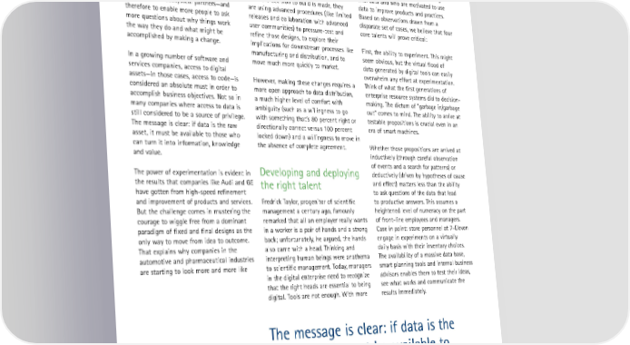 From Looking Digital to Being Digital: The Impact of Technology on the Future of Work The power of data access comes from the their software industry counterparts as they and more of the work of data collection opportunity it provides for people to make try to identify and explore new products embedded in sensors and intelligent tools, timely and more intelligent and impactful using models, simulations and digital the demand in the years ahead will be for business decisions. The challenge, however, exchanges with customers and suppliers employees who are capable of working comes from making the inner workings of before committing to build anything. And, with data and who are motivated to use the enterprise more visible—to workers, once the decision to build is made, they data to improve products and practices. managers and ecosystem partners—and are using advanced procedures (like limited Based on observations drawn from a therefore to enable more people to ask releases and collaboration with advanced disparate set of cases, we believe that four more questions about why things work user communities) to pressure-test and core talents will prove critical: the way they do and what might be refine those designs, to explore their accomplished by making a change. implications for downstream processes like First, the ability to experiment. This might manufacturing and distribution, and to seem obvious, but the virtual flood of In a growing number of software and move much more quickly to market. data generated by digital tools can easily services companies, access to digital overwhelm any effort at experimentation. assets—in those cases, access to code—is However, making these changes requires a Think of what the first generations of considered an absolute must in order to more open approach to data distribution, enterprise resource systems did to decision- accomplish business objectives. Not so in a much higher level of comfort with making. The dictum of “garbage in/garbage many companies where access to data is ambiguity (such as a willingness to go out” comes to mind. The ability to arrive at still considered to be a source of privilege. with something that’s 80 percent right or testable propositions is crucial even in an The message is clear: if data is the raw directionally correct versus 100 percent era of smart machines. asset, it must be available to those who locked down) and a willingness to move in can turn it into information, knowledge the absence of complete agreement. Whether those propositions are arrived at and value. inductively (through careful observation of events and a search for patterns) or The power of experimentation is evident in Developing and deploying deductively (driven by hypotheses of cause the results that companies like Audi and GE the right talent and effect) matters less than the ability have gotten from high-speed refinement to ask questions of the data that lead and improvement of products and services. Fredrick Taylor, progenitor of scientific to productive answers. This assumes a But the challenge comes in mustering the management a century ago, famously heightened level of numeracy on the part courage to wiggle free from a dominant remarked that all an employer really wants of front-line employees and managers. paradigm of fixed and final designs as the in a worker is a pair of hands and a strong Case in point: store personnel at 7-Eleven only way to move from idea to outcome. back; unfortunately, he argued, the hands engage in experiments on a virtually That explains why companies in the also came with a head. Thinking and daily basis with their inventory choices. automotive and pharmaceutical industries interpreting human beings were anathema The availability of a massive data base, are starting to look more and more like to scientific management. Today, managers smart planning tools and internal business in the digital enterprise need to recognize advisors enables them to test their ideas, that the right heads are essential to being see what works and communicate the digital. Tools are not enough. With more results immediately. The message is clear: if data is the raw asset, it must be available to those who can turn it into information, knowledge and value. 34 | Accenture | Copyright 2014 Accenture. All rights reserved. ©