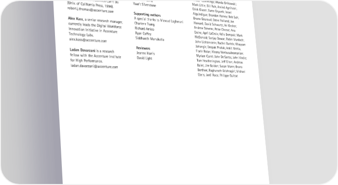 From Looking Digital to Being Digital: The Impact of Technology on the Future of Work About the authors Acknowledgments The authors would like to thank the following people for their Robert J. Thomas, managing director Sponsors insights and assistance: of the Accenture Institute for High Shawn Collinson John McGagh; Preston Chiaro; Mary Performance, is the author of Crucibles Paul Daugherty “Missy” Cummings; Wanda Orlikowski; of Leadership (Harvard Business Press, Matthew Reilly Mark Little; Bill Ruh; Arvind Agnihotri; 2008) and What Machines Can’t Do Yaarit Silverstone Erick Glazer; Evren Eryurek; Israel (Univ. of California Press, 1994). Alguindigue; Brandon Harvey; Bob Suh; [email protected] Supporting authors Bruno Gouraud; Steve Holland; Joe A special thanks to Masoud Loghmani Howard; David Schwartz; Ari Gesher; Alex Kass, a senior research manager, Charlene Tsang Andrew Stevens; Peter Cheese; Ana currently leads the Digital Workforce Richard Amico Dutra; April LaCroix; Kelly Dempski; Mark Innovation Initiative in Accenture Ryan Coffey McDonald; Sanjay Dawar; Robin Murdoch; Technology Labs. Siddhanth Munukutla John Lichtenstein; Rachel Bartels; Khayyam [email protected] Jahangir; Deepak Phatak; Ankit Mehta, Reviewers Florin Rotar; Meena Vembusubramanian; Ladan Davarzani is a research Jeanne Harris Myriam Curet; John DelSanto; John Hindle; fellow with the Accenture Institute David Light Tom Heatherington; Jeff Elton; Andreas for High Performance. Baier; Jim Golden; Susan Mann; Bruno [email protected] Berthon; Raghunath Krishnagiri; Michael Ebels; Jordi Roca; Philippe Guittat 41 | Accenture | Copyright 2014 Accenture. All rights reserved. ©