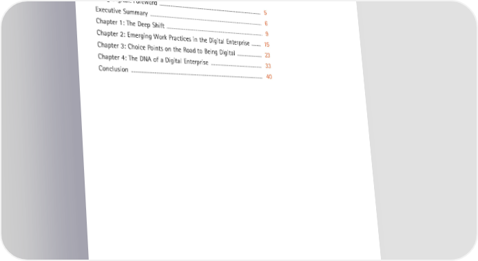 From Looking Digital to Being Digital: The Impact of Technology on the Future of Work Table of Contents Being Digital: Foreword ..................................................................................................................... 5 ................................................................................................................................ 6 Executive Summary ............................................................................................................... 9 Chapter 1: The Deep Shift ........... 15 Chapter 2: Emerging Work Practices in the Digital Enterprise ............................. 23 Chapter 3: Choice Points on the Road to Being Digital ............................................................ 33 Chapter 4: The DNA of a Digital Enterprise Conclusion .................................................................................................................................................... 40 3 | Accenture | Copyright 2014 Accenture. All rights reserved. ©