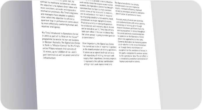 From Looking Digital to Being Digital: The Impact of Technology on the Future of Work companies like global mining giant Rio The Operations Centre is exactly what it traditional mining know-how. And, it Tinto, skilled operators, data analysts and sounds like: a facility where equipment provides a hugely important link between engineers guide the intricate interplay of operators sit in a command centre the company’s growing staff of quantitative gigantic drills and excavators, gargantuan hundreds of miles away from the mine. analysts and the mines themselves. earth movers and dump trucks, and trains pulling hundreds of cars headed to ports Built originally to provide a more attractive The Operations Centre has already and refineries around the globe. But, by work environment for always-scarce skilled demonstrated clear and impressive contrast to traditional automation—where workers, the Operations Centre has brought results: increased efficiency, improved the objective is to replace direct labor with operators face-to-face to share common reliability, decreased variability and better more consistent, accurate and repeatable screen views of the mine and its environs, identification of performance issues. mechanical processes—Rio Tinto’s engineers and to orchestrate their work in response and managers have adopted a systemic to changing conditions like weather, truck Analysts, many of whom are scientists view: where the objective to achieve a breakdowns or major equipment moves. and mathematicians with only a passing quantum leap in performance comes about Physical proximity encouraged operators knowledge of mining, grind through by more effectively combining human and to collaborate and mutually adjust. As one massive databases generated hourly by machine intelligence. senior executive put it, “they could finally sensing equipment in mines throughout look each other in the eye and know that the world and make recommendations Rio Tinto introduced its Operations Centre the other person is going to make good on to operators in the Operations Centre in 2010 as part of its Mine of the Future™ a commitment.” about new approaches to their jobs. programme to service its iron ore business Common dedication to improving system in Western Australia. The Operations Centre More importantly, the Operations Centre yield—whether in the mines themselves in Perth is “Mission Control” for Rio Tinto’s has turned out to be an essential ingredient or through timely maintenance of entire Pilbara network that consists of in the transformation of mining operations. equipment or the avoidance of delays in 15 mines, up to 1,500km of rail, and 3 It serves as an operational hub and as a the ports—complements common access port terminals as well as power and other rich repository of mining, transport and to the operational data. The net effect is infrastructure. supply chain experience. In many respects a remarkably productive combination of it represents the optimal combination human and machine talents. of high-tech work environment and 27 | Accenture | Copyright 2014 Accenture. All rights reserved. ©