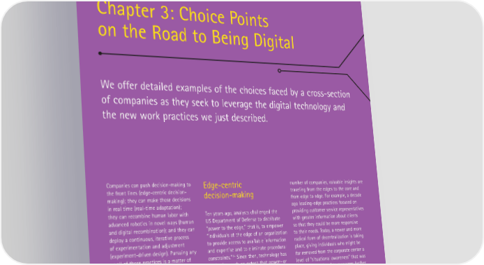 From Looking Digital to Being Digital: The Impact of Technology on the Future of Work Chapter 3: Choice Points on the Road to Being Digital We offer detailed examples of the choices faced by a cross-section of companies as they seek to leverage the digital technology and the new work practices we just described. Companies can push decision-making to Edge-centric number of companies, valuable insights are the front lines (edge-centric decision- decision-making traveling from the edges to the core and making); they can make those decisions from edge to edge. For example, a decade in real time (real-time adaptation); ago leading-edge practices focused on they can recombine human labor with Ten years ago, analysts challenged the providing customer service representatives advanced robotics in novel ways (human US Department of Defense to distribute with greater information about clients and digital recombination); and they can “power to the edge,” that is, to empower so that they could be more responsive deploy a continuous, iterative process “individuals at the edge of an organization to their needs. Today, a newer and more of experimentation and adjustment to provide access to available information radical form of decentralization is taking (experiment-driven design). Pursuing any and expertise and to eliminate procedural place, giving individuals who might be 14 or all of those practices is a matter of constraints.” Since then, technology has far removed from the corporate center a choice that deserves careful consideration. evolved to such an extent that power—or level of “situational awareness” that was at least information—has indeed moved previously restricted to managers further 15 to the edge in many organizations. Not up the chain of command. only that but the authority to make decisions is moving to the edges along with that information. And, in a growing 23 | Accenture | Copyright 2014 Accenture. All rights reserved. ©