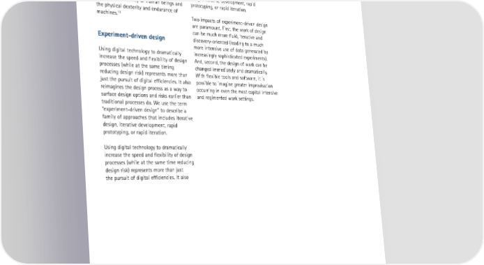 From Looking Digital to Being Digital: The Impact of Technology on the Future of Work The second approach is more novel. Small, reimagines the design process as a way to flexible robots interact with human workers surface design options and risks earlier than by sensing and adapting to their shared traditional processes do. We use the term environment in real time. The two can learn “experiment-driven design” to describe a from each other and together create a family of approaches that includes iterative division of labor that captures the cognitive design, iterative development, rapid power and creativity of human beings and prototyping, or rapid iteration. the physical dexterity and endurance of 13 machines. Two impacts of experiment-driven design are paramount. First, the work of design can be much more fluid, iterative and Experiment-driven design discovery-oriented (leading to a much more intensive use of data generated by Using digital technology to dramatically increasingly sophisticated experiments). increase the speed and flexibility of design And, second, the design of work can be processes (while at the same timing changed immediately and dramatically. reducing design risk) represents more than With flexible tools and software, it is just the pursuit of digital efficiencies. It also possible to imagine greater improvisation reimagines the design process as a way to occurring in even the most capital intensive surface design options and risks earlier than and regimented work settings. traditional processes do. We use the term “experiment-driven design” to describe a family of approaches that includes iterative design, iterative development, rapid prototyping, or rapid iteration. Using digital technology to dramatically increase the speed and flexibility of design processes (while at the same time reducing design risk) represents more than just the pursuit of digital efficiencies. It also 21 | Accenture | Copyright 2014 Accenture. All rights reserved. ©
