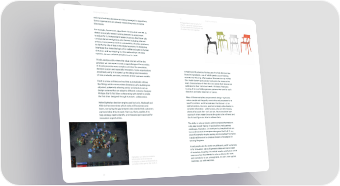 T5 Designing intelligence T5 Designing intelligence and more business decisions are being managed by algorithms. Philippe Starck and Kartell’s “A.I” chair is a physical representation Some organizations are already researching ways to tackle of what people and machines can bias issues. do when they work together. For example, Accenture’s algorithmic fairness tool uses ML to detect potentially biased training data and suggest ways to adjust for it. Independent research groups like Share Lab conduct data investigations into themes including internet privacy, transparency and the sustainability of online platforms to clarify the role of data in the digital economy. By designing interfaces that make the logic of AI visible and open to human direction, and by mapping out the relationships between systems, we can enhance people’s trust in them. Thirdly, and possibly where the value created will be the greatest, we can expect to see a rapid change of focus within AI development to more complex activities like simulation, decision support and especially innovation. Some organizations In health and life sciences, Nuritas uses AI to help discover new are already using AI to speed up the design and innovation bioactive ingredients – one of which speeds up post-training of new products, services, and even entire business models. recovery by reducing inflammation. Skincare start-up Atolla’s Skin Health System gives people testing kits that measure the Finch is a new architectural tool that automatically reflows exact characteristics of their skin then sends them face serum the fittings within rooms when dimensions of a building are calibrated to their individual needs. US-based Freenome adjusted, potentially allowing senior architects to set up is using AI to turn hidden genome patterns into tools for early design systems that can adapt to different contexts. Designer detection and better treatment of cancer. Philippe Starck has been collaborating with Kartell to create the first chair designed through human/AI collaboration. Many of these examples use parametric design – a process where people set the goals, constraints and processes for a MakerSights is a decision engine used by Levi’s, Madewell and specific problem, and AI accelerates the discovery of an Allbirds that determines which styles will be winners and optimal solution. However, parametric design relies heavily on losers, narrowing the gap between what brands think customers complete information – unlike humans, who can infer missing want and what they do want. Start-up, Klydo, applies AI to pieces of a puzzle they can’t yet see. Neuro-evolution is an help strategy teams identify, prioritize and gain approval for approach where researchers set the goals to be achieved and innovation opportunities. the AI must figure out how to achieve them. The ability to solve problems with incomplete information is a big step toward making AI applicable to real business challenges. AlphaStar, (AI developed by DeepMind that can beat professionals at complex video game StarCraft II), is a powerful example: despite starting with incomplete information, it explored the world to create a diversity of strategies for winning the game. AI and people view the world very differently, and if we harness AI for innovation, we could generate ideas we’d never dream of ourselves. Coupling this radical novelty with human social AlphaStar can take incomplete awareness has the potential to solve problems of a scale information and still devise and complexity as yet unimaginable. It’s not a race against strategies to beat professionals at complex video game, StarCraft II. machines, but with machines. 69 70