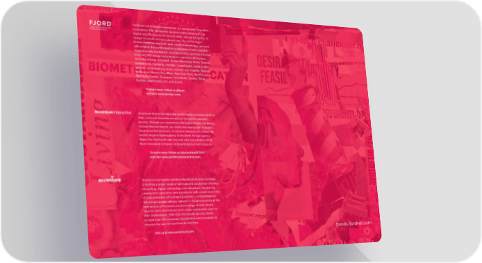Fjord, part of Accenture Interactive, is a design and innovation consultancy that reimagines people’s relationships with the digital and physical world around them. We use the power of design to create services people love. By combining a human-centered approach with robust methodology, we work with some of the world’s leading businesses to make complex systems simple and elegant. Founded in 2001, Fjord has a diverse team of 1,200 design and innovation experts in 33 studios, including Atlanta, Auckland, Austin, Barcelona, Berlin, Bogotá, Buenos Aires, Canberra, Chicago, Copenhagen, Dubai, Dublin, Helsinki, Johannesburg, Lima, London, Los Angeles, Madrid, Melbourne, Mexico City, Milan, New York, Paris, San Francisco, São Paulo, Seattle, Singapore, Stockholm, Sydney, Tokyo, Toronto, Washington, D.C. and Zurich. To learn more, follow us @fjord and visit www.fjordnet.com. Accenture Interactive helps the world’s leading brands transform their customer experiences across the entire customer journey. Through our connected offerings in design, marketing, content and commerce, we create new ways to win in today’s experience-led economy. Accenture Interactive is ranked the world’s largest digital agency in the latest Ad Age Agency Report for the fourth year in a row, and was named a 2019 Most Innovative Company in Advertising by Fast Company. To learn more, follow us @AccentureACTIVE and visit www.accentureinteractive.com. Accenture is a leading global professional services company, providing a broad range of services and solutions in strategy, consulting, digital, technology and operations. Combining unmatched experience and specialized skills across more than 40 industries and all business functions — underpinned by the world’s largest delivery network — Accenture works at the intersection of business and technology to help clients improve their performance and create sustainable value for their stakeholders. With 492,000 people serving clients in more than 120 countries, Accenture drives innovation to improve the way the world works and lives. Visit us at www.accenture.com. trends.fjordnet.com