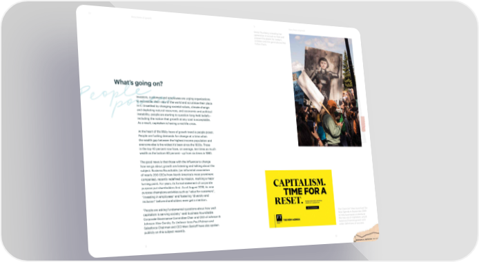 T1 Many faces of growth T1 Many faces of growth Greta Thunberg is leading her generation in a push to heal and protect the planet for today’s children and the generations that follow them. What’s going on? Investors, customers and employees are urging organizations to reconsider their view of the world and scrutinize their place in it. Unsettled by changing societal values, climate change and depleting natural resources, and economic and political instability, people are starting to question long-held beliefs – including the notion that growth at any cost is acceptable. As a result, capitalism is having a mid-life crisis. At the heart of the Many faces of growth trend is people power. People are fueling demands for change at a time when the wealth gap between the highest income population and everyone else is the widest it’s been since the 1930s. Those in the top 40 percent now have, on average, ten times as much wealth as the bottom 60 percent – up from six times in 1980. The good news is that those with the influence to change how we go about growth are listening and talking about the subject. Business Roundtable, (an influential association of nearly 200 CEOs from North America’s most prominent companies), recently redefined its mission, marking a major turning point. For years, its formal statement of corporate purpose put shareholders first. As of August 2019, its new purpose champions activities such as “value for customers”, “investing in employees” and fostering “diversity and inclusion” before shareholders even get a mention. “People are asking fundamental questions about how well capitalism is serving society,” said Business Roundtable The Financial Times launched The Corporate Governance Committee Chair and CEO of Johnson & New Agenda in September 2019 Johnson Alex Gorsky. Ex-Unilever boss Paul Polman and to help businesses understand Salesforce Chairman and CEO Marc Benioff have also spoken the new era of capitalism, which balances financial growth with publicly on this subject recently. wider definitions of success. 9 10