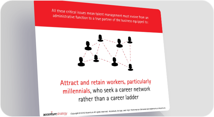 All these critical issues mean talent management must evolve from an administrative function to a true partner of the business equipped to: Attract and retain workers, particularly millennials, who seek a career network rather than a career ladder Copyright © 2016 Accenture All rights reserved. Accenture, its logo, and High Performance Delivered are trademarks of Accenture.
