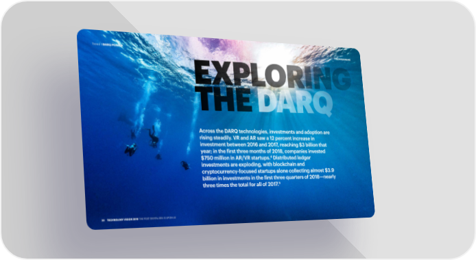 Trend 1 DARQ POWER #TECHVISION2019 EXPLORING THE DARQ Across the DARQ technologies, investments and adoption are rising steadily� VR and AR saw a 12 percent increase in investment between 2016 and 2017, reaching $3 billion that year; in the first three months of 2018, companies invested 4 $750 million in AR/VR startups� Distributed ledger investments are exploding, with blockchain and cryptocurrency-focused startups alone collecting almost $3�9 billion in investments in the first three quarters of 2018—nearly 5 three times the total for all of 2017� 2020 TECHNOLOGY VISION 2019 THE POST-DIGITAL ERA IS UPON US