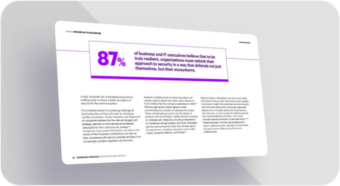 Trend 4 SECURE US TO SECURE ME #TECHVISION2019 of business and IT executives believe that to be truly resilient, organizations must rethink their 87% approach to security in a way that defends not just themselves, but their ecosystems� a rigid, consistent set of standards along with an Siemens is helping move its entire ecosystem and Beyond industry, enterprises must work more closely auditing body to ensure a better foundation of industry players toward this reality with a Charter of with governments as well. Governments have valuable security for the entire ecosystem. Trust initiative that the company established in 2018.30 cross-sector insight and enterprises are becoming the Partners signing the charter agree to make new front lines where both criminal and state-level It’s a creative solution to a pressing challenge all commitments to a number of cybersecurity tenets. attacks occur. Consider attacks like those faced by businesses face as they work with an increasing These include baking security into the design of Sony Pictures, or more recently the NotPetya attacks number of partners. Across industries, just 39 percent products and technologies, collaboratively innovating that impacted Maersk and FedEx—all of which of companies believe that the data exchanged with on cybersecurity measures, providing transparency involved malware attributed to state-level actors.32,33 strategic partners or third parties are protected on incidents to all participants, and more. Ecosystem Threats that seem criminal may be state-level in adequately by their cybersecurity strategy.29 partners and competitors alike have already signed nature, underscoring the importance of businesses Companies must assess third parties not only on the the agreement, including enterprises such as AES, and governments addressing cybersecurity merits of their business contributions, but also on Airbus, Deutsche Telekom, and Daimler.31 collaboratively. their compliance with security policies and laws in an increasingly complex regulatory environment. 68 TECHNOLOGY VISION 2019 THE POST-DIGITAL ERA IS UPON US