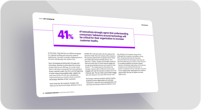 Trend 2 GET TO KNOW ME #TECHVISION2019 of executives strongly agree that understanding consumers’ behaviors around technology will 41% be critical for their organization to increase customer loyalty� At first blush, these feel like very different strategies valuable that it has done away with the traditional life new ambiguity and complexity, along with key for customer profiling and improving customer insurance model. Now, the company offers interactive challenges that companies must address. Among experiences—but each is actually a stepping stone to life insurance policies that incorporate clients’ fitness them: recognizing that there are times when the same ultimate goal: the market of one. and health data through wearable devices. John consumers want more technology in their lives, but Hancock’s “Vitality” program policyholders qualify for also times when they do not want it in their lives at all. Savvy businesses are taking their first steps with discounts when they hit certain exercise targets and To successfully establish and maintain ongoing, technology identities to personalize their existing can get personalized premiums and rewards for their intensely individualized relationships with consumers, 13,14 companies must understand that dynamic. In product and service offerings. It’s a smart move; activity. The results speak for themselves: the there is still value to be gained from personalization- average customer with a traditional insurance plan essence, businesses must earn and retain consumers’ driven customer loyalty. But this is just the beginning engages with their life insurance company one to two trust by weighing their needs against the company’s of what is becoming possible today. Leaders can times per year. The new Vitality policyholders engage opportunities—and that will require a non-stop 15 balancing act. push even further to craft new individualized, with John Hancock more than 500 times per year. experiential business models entirely around the technology identities of their customers. Technology is letting businesses maintain ongoing, experience-driven relationships with individual North American life insurance company John consumers in ways that were impossible before. But Hancock has found technology identities to be so with these technology-enabled possibilities comes 34 TECHNOLOGY VISION 2019 THE POST-DIGITAL ERA IS UPON US
