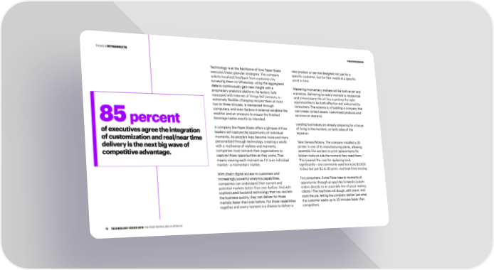 Trend 5 MYMARKETS #TECHVISION2019 Technology is at the backbone of how Paper Boats new product or service designed not just for a executes these granular strategies. The company specific customer, but for their needs at a specific solicits localized feedback from customers by point in time. surveying them on WhatsApp, using the aggregated data to continuously gain new insight with a Mastering momentary markets will be both an art and proprietary analytics platform. Its factory, fully a science. Delivering for every moment is impractical equipped with Internet of Things (IoT) sensors, is and unnecessary; the art lies in picking the right extremely flexible: changing recipes takes at most opportunities to be both effective and welcomed by two to three minutes, is transacted through consumers. The science is in building a company that computers, and even factors in external variables like can create context-aware, customized products and weather and air pressure to ensure the finished services on demand. 85 percent beverage tastes exactly as intended. Leading businesses are already preparing for a future of executives agree the integration A company like Paper Boats offers a glimpse of how of living in the moment, on both sides of the leaders will capture the opportunity of individual equation. of customization and real/near time moments. As people’s lives become more and more personalized through technology, creating a world Take General Motors. The company installed a 3D delivery is the next big wave of with a multiverse of realities and moments, printer in one of its manufacturing plants, allowing competitive advantage. companies must reinvent their organizations to assembly line workers to print replacements for 2 capture those opportunities as they come. That broken tools on-site the moment they need them. means viewing each moment as if it is an individual This lowered the cost for replacing tools market—a momentary market. significantly—one commonly-used tool cost $3,000 to buy but just $3 to 3D print—and kept lines moving. With direct digital access to customers and increasingly powerful analytics capabilities, For consumers, Zume Pizza rises to moments of companies can understand their current and opportunity through an app that forwards custom potential markets better than ever before. And with orders directly to an assembly line of pizza-making 3 sophisticated backend technology that can reorient robots. The machines roll dough, add sauce, and the business quickly, they can deliver for those cook the pie, letting the company deliver just what markets faster than ever before. Put those capabilities the customer wants up to 20 minutes faster than together and every moment is a chance to deliver a competitors. 75 TECHNOLOGY VISION 2019 THE POST-DIGITAL ERA IS UPON US