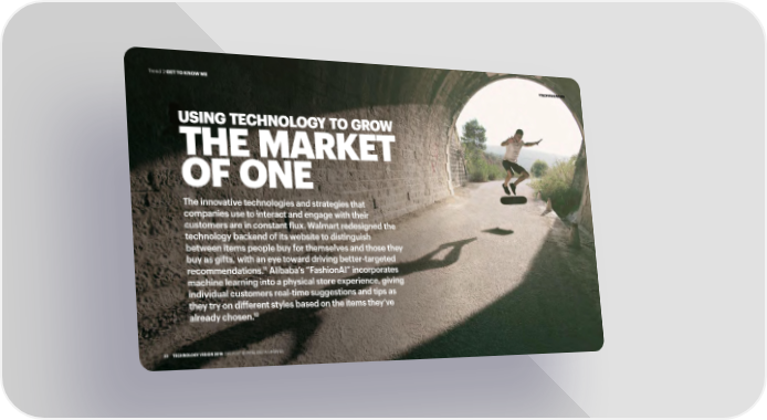 Trend 2 GET TO KNOW ME #TECHVISION2019 using technology to grow the market of one The innovative technologies and strategies that companies use to interact and engage with their customers are in constant flux. Walmart redesigned the technology backend of its website to distinguish between items people buy for themselves and those they buy as gifts, with an eye toward driving better-targeted 11 Alibaba’s “FashionAI” incorporates recommendations� machine learning into a physical store experience, giving individual customers real-time suggestions and tips as they try on different styles based on the items they’ve 12 already chosen� 33 TECHNOLOGY VISION 2019 THE POST-DIGITAL ERA IS UPON US