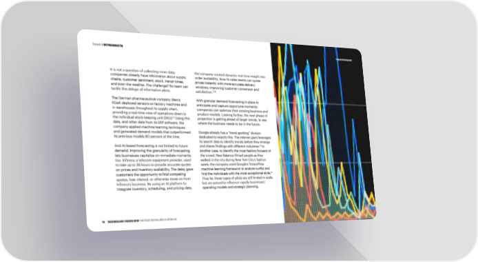 Trend 5 MYMARKETS #TECHVISION2019 It is not a question of collecting more data; the company created dynamic real-time insight into companies already have information about supply order availability. Now its sales teams can quote chains, customer sentiment, stock, transit times, prices instantly with more accurate delivery and even the weather. The challenge? No team can windows, improving customer conversion and 11,12 tackle this deluge of information alone. satisfaction. The German pharmaceutical company Merck With granular demand forecasting in place to KGaA deployed sensors on factory machines and anticipate and capture opportune moments, in warehouses throughout its supply chain, companies can optimize their existing business and providing a real-time view of operations down to product models. Looking further, the next phase of 10 the individual stock-keeping unit (SKU). Using this projection is getting ahead of larger trends, to see data, and other data from its ERP software, the where the business needs to be in the future. company applied machine learning techniques and generated demand models that outperformed Google already has a “trend spotting” division its previous models 80 percent of the time. dedicated to exactly this. The internet giant leverages its search data to identify trends before they emerge 13 And AI-based forecasting is not limited to future and shares findings with different industries. In demand. Improving the granularity of forecasting another case, to identify the most fashion-forward of lets businesses capitalize on immediate moments, the crowd, New Balance filmed people as they too. Infinera, a telecom equipment provider, used walked in the city during New York City’s fashion to take up to 36 hours to provide accurate quotes week; the company used Google’s TensorFlow on prices and inventory availability. The delay gave machine learning framework to analyze outfits and 14 customers the opportunity to find competing find the individuals with the most exceptional style. quotes, lose interest, or otherwise move on from Thus far, these types of pilots are still limited in scale, Infinera’s business. By using an AI platform to but are poised to influence rapidly businesses’ integrate inventory, scheduling, and pricing data, operating models and strategic planning. 78 TECHNOLOGY VISION 2019 THE POST-DIGITAL ERA IS UPON US