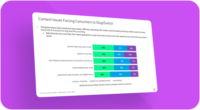 Content Issues Forcing Consumers to Stop/Switch • Taking too long to load, excessively long content, difficulty interacting with content, and not loading are all top content issues that cause nearly half of consumers to stop what they are doing. ‒ Baby Boomers are more likely than newer generations to stop what they’re doing when they experience any of the following content issues. CONTENT TAKES TOO LONG TO LOAD 47% 31% 22% CONTENT IS TOO LONG 47% 23% 30% HAVE TROUBLE INTERACTING WITH THE CONTENT ON THE DEVICE 45% 38% 17% CONTENT/IMAGES WON'T LOAD 44% 35% 21% CONTENT NOT DISPLAYING WELL ON CURRENT DEVICE 34% 48% 18% STOP ALL TOGETHER SWITCH TO A DIFFERENT DEVICE UNCHANGED PROBLEMS ENCOUNTERED AND REACTIONS TO VIEWING CONTENT ON DEVICES © 2017 Adobe Systems Incorporated. All Rights Reserved. Adobe Confidential.