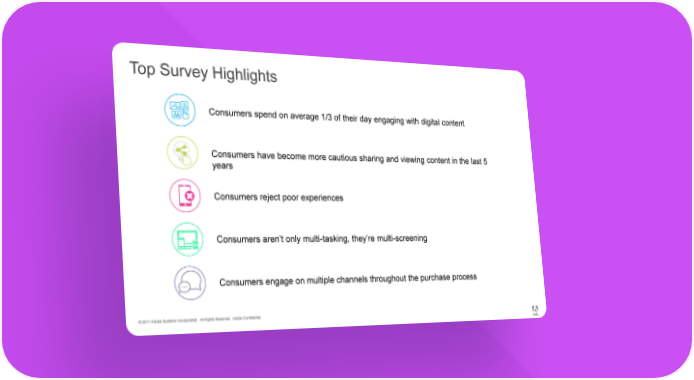 Top Survey Highlights Consumers spend on average 1/3 of their day engaging with digital content Consumers have become more cautious sharing and viewing content in the last 5 years Consumers reject poor experiences Consumers aren’t only multi-tasking, they’re multi-screening Consumers engage on multiple channels throughout the purchase process © 2017 Adobe Systems Incorporated. All Rights Reserved. Adobe Confidential.