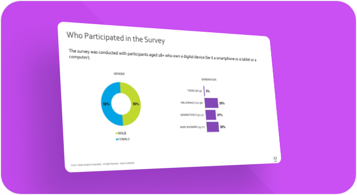 Who Participated in the Survey The survey was conducted with participants aged 18+ who own a digital device (be it a smartphone or a tablet or a computer). GENDER GENERATION TEENS (18-19) 2% 50% 50% MILLENNIALS (20-36) 35% GENERATION X (37-52) 27% BABY BOOMERS (53-71) 32% MALE FEMALE © 2017 Adobe Systems Incorporated. All Rights Reserved. Adobe Confidential.