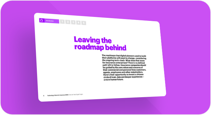 Introduction 1 2 3 4 5 Leaving the roadmap behind The roadmaps that digital pioneers used to build their platforms will need to change, considering the ongoing tech-clash. What does that mean for insurance enterprises? There’s no defined path left to follow. Insurance companies should be guided by the core values and concerns of their commercial and personal lines customers, agents, employees and other stakeholders. Here’s their opportunity to invent a virtuous circle of trust, data and deeper experiences— a more human future. 8 Technology Vision for Insurance 2020 | We, the Post-Digital People