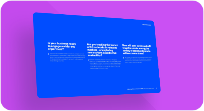 #TECHVISION2020 Is your business ready Are you tracking the launch How will your business build to engage a wider set of 5G networks in relevant trust for robots among the of partners? markets—or exploring variety of stakeholders who new markets based on 5G will encounter them? T o ensure the success of robotics innovations, companies need availability? to be prepared to interact with a larger set of stakeholders. Engage government regulators to create policies for autonomous devices T ake steps to help people who are interacting with these devices to understand machine behavior. Consider the user experience in new environments and identify vendors for collaboration to I ncreased access to 5G networks will help spur widespread and human-machine interaction expertise your company will shape strategic agendas. adoption of connected assets, including robotics. Increased mobile need to navigate these uncertain waters. network speeds and lower latency are major factors that will enable autonomous devices in new environments. Look for opportunities to capitalize on nearby launch markets and explore the industrial applications that 5G networks present. Technology Vision for Insurance 2020 | We, the Post-Digital People 49