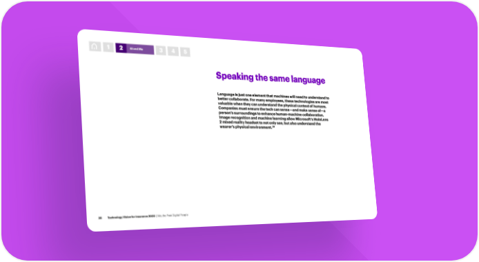 1 2 AI and Me 3 4 5 Speaking the same language Language is just one element that machines will need to understand to better collaborate. For many employees, these technologies are most valuable when they can understand the physical context of humans. Companies must ensure the tech can sense—and make sense of—a person’s surroundings to enhance human-machine collaboration. Image recognition and machine learning allow Microsoft’s HoloLens 2 mixed reality headset to not only see, but also understand the wearer’s physical environment.26 26 Technology Vision for Insurance 2020 | We, the Post-Digital People