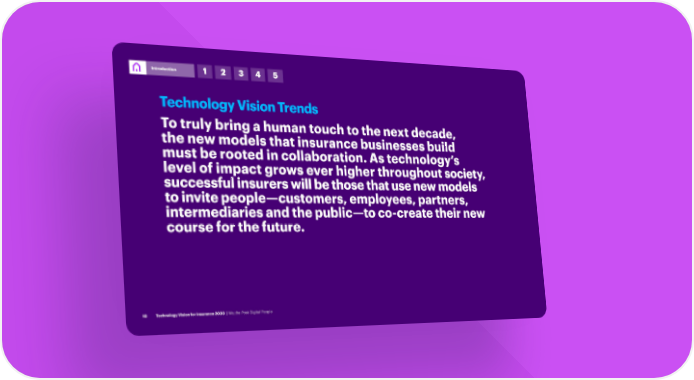 Introduction 1 2 3 4 5 Technology Vision Trends To truly bring a human touch to the next decade, the new models that insurance businesses build must be rooted in collaboration. As technology’s level of impact grows ever higher throughout society, successful insurers will be those that use new models to invite people—customers, employees, partners, intermediaries and the public—to co-create their new course for the future. 10 Technology Vision for Insurance 2020 | We, the Post-Digital People