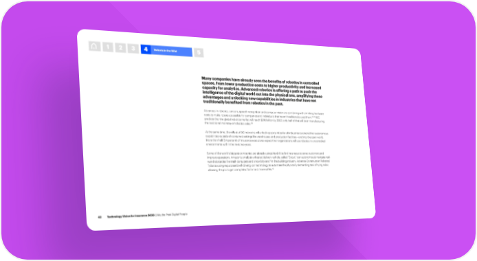 1 2 3 4 Robots in the Wild 5 Many companies have already seen the benefits of robotics in controlled spaces, from lower production costs to higher productivity and increased capacity for analytics. Advanced robotics is offering a path to push the intelligence of the digital world out into the physical one, amplifying these advantages and unlocking new capabilities in industries that have not traditionally benefited from robotics in the past. Advances in robotics, sensors, speech recognition and computer vision are combining with shrinking hardware 38,39 costs to make robots accessible for companies and individuals that haven’t traditionally used them. IDC predicts that the global robotics market will reach $210 billion by 2022; only half of that will be in manufacturing, 40 the traditional mainstay of robotics sales. At the same time, the rollout of 5G networks will unlock opportunities for all industries to extend their autonomous capabilities outside of contained settings like warehouses and production facilities—and into the open world. More than half (54 percent) of insurance executives expect their organizations will use robotics in uncontrolled environments within the next two years. Some of the world’s biggest companies are already using this shift to find new ways to serve customers and improve operations. Amazon’s small, six-wheeled delivery vehicle, called “Scout,” can autonomously navigate real- 41 world obstacles like trash cans, pets and snow blowers. In the building industry, Advance Construction Robotics’ TyBot is using repurposed self-driving-car technology to automate the physically demanding task of tying rebar, 42 allowing the job to get completed faster and more safely. 42 Technology Vision for Insurance 2020 | We, the Post-Digital People