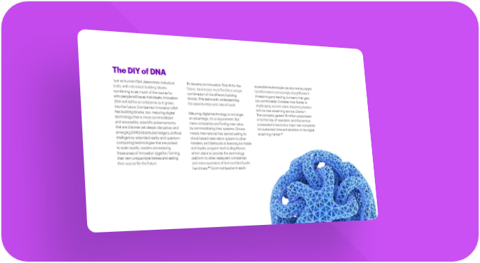 The DIY of DNA Just as human DNA determines individual To develop an innovation DNA fit for the accessible technologies are also making digital traits, with chemical building blocks future, businesses must find their unique transformations increasingly straightforward— combining to set much of the course for combination of the different building threatening any leading company that gets who people will be as individuals, innovation blocks. This starts with understanding too comfortable. Consider how Disney is DNA will define an enterprise as it grows the opportunities and risks of each. challenging current video streaming leaders into the future. Companies’ innovation DNA with its new streaming service, Disney+. has building blocks, too: maturing digital Maturing digital technology is no longer The company gained 10 million subscribers technology that is more commoditized an advantage, it’s a requirement. But in its first day of operation, and the service and accessible; scientific advancements many companies are finding new value is expected to become a major new competitor that are discrete yet deeply disruptive; and by commoditizing their systems. Choice for customers’ time and attention in the digital 6,7 emerging DARQ (distributed ledgers, artificial Hotels International has started selling its streaming market. intelligence, extended reality and quantum cloud-based reservation system to other computing) technologies that are poised hoteliers, and Starbucks is licensing its mobile to scale rapidly. Leaders are weaving and loyalty program tech to Brightloom, these areas of innovation together, forming which plans to provide the technology their own unique triple helixes and setting platform to other restaurant companies their course for the future. and more operators of licensed Starbucks 4,5 franchises. Commoditized and easily 111122