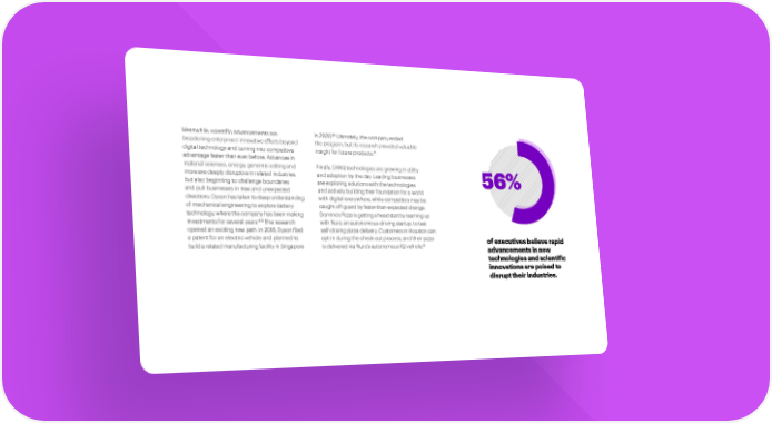 10 Meanwhile, scientific advancements are in 2020. Ultimately, the company ended broadening enterprises’ innovative efforts beyond the program, but its research provided valuable 11 digital technology and turning into competitive insight for future products. advantage faster than ever before. Advances in material sciences, energy, genomic editing and Finally, DARQ technologies are growing in utility more are deeply disruptive in related industries, and adoption by the day. Leading businesses but also beginning to challenge boundaries are exploring solutions with the technologies 56% and pull businesses in new and unexpected and actively building their foundation for a world directions. Dyson has taken its deep understanding with digital everywhere, while competitors may be of mechanical engineering to explore battery caught off-guard by faster-than-expected change. technology, where the company has been making Domino’s Pizza is getting a head start by teaming up 8,9 investments for several years. The research with Nuro, an autonomous-driving startup, to test opened an exciting new path. In 2018, Dyson filed self-driving pizza delivery. Customers in Houston can a patent for an electric vehicle and planned to opt-in during the check-out process, and their pizza of executives believe rapid 12 build a related manufacturing facility in Singapore is delivered via Nuro’s autonomous R2 vehicle. advancements in new technologies and scientific innovations are poised to disrupt their industries.