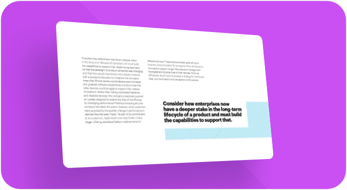 11 Consider how enterprises now have a deeper stake affected phones. Apple demonstrated what will soon in the long-term lifecycle of a product and must build become a basic function for companies from all industries: the capabilities to support that. Apple recognized early the need to support longer lifecycles and manage both on that the paradigm of product ownership was changing, the digital and physical lives of their devices. To do so and that they would need to be more deeply involved effectively, they’ll need to develop a strategy for continued with a product’s lifecycle. For instance, the company clear communication and transparency with people. knew that iPhone owners would always want the latest and greatest software experiences, but also knew that older devices could struggle to support their newest innovations. Rather than risking overloaded batteries and disabled devices, the company proactively pushed an update designed to extend the lives of the iPhones 10 by managing performance. Without knowing why the Consider how enterprises now company had taken this action, however, some customers have a deeper stake in the long-term were surprised by the sudden change in performance in devices they felt were “theirs.” As part of its commitment lifecycle of a product and must build to its customers, Apple took it one step further: it also the capabilities to support that. began offering subsidized battery replacements for