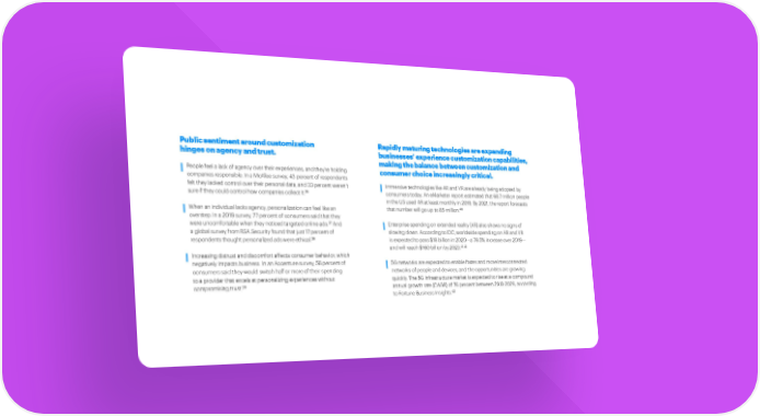 Public sentiment around customization Rapidly maturing technologies are expanding hinges on agency and trust. businesses’ experience customization capabilities, making the balance between customization and People feel a lack of agency over their experiences, and they’re holding consumer choice increasingly critical. companies responsible. In a McAfee survey, 43 percent of respondents felt they lacked control over their personal data, and 33 percent weren’t Immersive technologies like AR and VR are already being adopted by 36 sure if they could control how companies collect it. consumers today. An eMarketer report estimated that 68.7 million people in the US used AR at least monthly in 2019. By 2021, the report forecasts 40 When an individual lacks agency, personalization can feel like an that number will go up to 85 million. overstep. In a 2019 survey, 77 percent of consumers said that they 37 were uncomfortable when they noticed targeted online ads. And Enterprise spending on extended reality (XR) also shows no signs of a global survey from RSA Security found that just 17 percent of slowing down. According to IDC, worldwide spending on AR and VR respondents thought personalized ads were ethical.38 is expected to pass $18 billion in 2020—a 78.5% increase over 2019— and will reach $160 billion by 2023.41,42 Increasing distrust and discomfort affects consumer behavior, which negatively impacts business. In an Accenture survey, 58 percent of 5G networks are expected to enable faster and more interconnected consumers said they would switch half or more of their spending networks of people and devices, and the opportunities are growing to a provider that excels at personalizing experiences without quickly. The 5G infrastructure market is expected to rise at a compound compromising trust.39 annual growth rate (CAGR) of 76 percent between 2018-2026, according to Fortune Business Insights.43