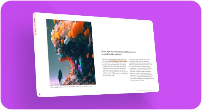 d e r e v li e d, d e eal d, s e gn i S 05 We see signs that tokenization could be a win-win for people and for marketers. The rise of digital ownership, through blockchain Today’s tokens of life range from the important technology, is shifting the power dynamic to users to the useful, the permanent to the fleeting. by putting them in control of their digital identity Important tokens generally cannot be transferred through non-transferable fungible tokens stored between people. Some prove who a person is, (like in digital wallets. What are tokens? When people birth certificate, passport, citizenship card, etc.), check their coat at an event, they get a ticket in and others are critical for a specific purpose, (such exchange, showing a unique number matching as driver’s license, medical records, education that on the coat hanger. The little slip of paper is a certificates, employee ID badge, homeowners’ physical token that represents that coat and serves deeds, etc.). This trend is just as important for as proof of who owns it. those institutions that create personal identifying information—such as government agencies for personal data, universities for credentialed degrees and so on—as it is for brands. + 8bit digital art, octane render, 3d mixed media, aspect ratio 3:2, algorithm version 4 Copyright © 2022 Accenture. All rights reserved. 63