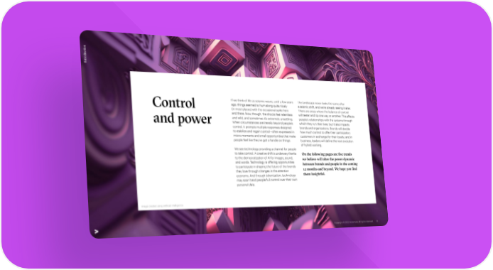 n o i ct u d o tr In If we think of life as seismic waves, until a few years The landscape never looks the same after Control ago, things seemed to hum along quite nicely a seismic shift, and we’re already seeing it alter. (in most places) with the occasional spike here There are areas where the balance of control and there. Now, though, the shocks feel relentless will teeter and tip one way or another. This affects and wild, and sometimes it’s extremely unsettling. people’s relationships with the systems through and power When circumstances are literally beyond people’s which they run their lives, but it also impacts control, it prompts multiple responses designed brands and organizations. Brands will decide to stabilize and regain control—often expressed in how much control to offer their participatory micro-moments and small opportunities that make customers in exchange for their loyalty, and in people feel like they’ve got a handle on things. business, leaders will define the next evolution of hybrid working. We see technology providing a channel for people to take control. A creative shift is underway thanks On the following pages are five trends to the democratization of AI for images, sound, we believe will alter the power dynamic and words. Technology is offering opportunities between brands and people in the coming to participate in shaping the future of the brands 12 months and beyond. We hope you find they love through changes in the attention economy. And through tokenization, technology them insightful. may soon hand people full control over their own personal data. Image created using artificial intelligence Copyright © 2022 Accenture. All rights reserved. III