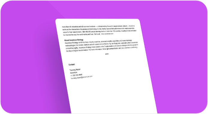 more than 40 industries and all business functions — underpinned by the world’s largest delivery network — Accenture works at the intersection of business and technology to help clients improve their performance and create sustainable value for their stakeholders. With 469,000 people serving clients in more than 120 countries, Accenture drives innovation to improve the way the world works and lives. Visit us at www.accenture.com. About Accenture Strategy Accenture Strategy combines deep industry expertise, advanced analytics capabilities and human-led design methodologies that enable clients to act with speed and confidence. By identifying clear, actionable paths to accelerate competitive agility, Accenture Strategy helps leaders in the C-suite envision and execute strategies that drive growth in the face of digital transformation. For more information, follow @AccentureStrat or visit www.accenture.com/strategy. # # # Contact: Tourang Nazari Accenture +1 202 322 4640 tourang.nazari@accenture.com