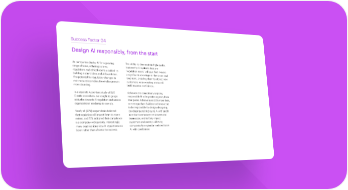 Success Factor 04 Design AI responsibly, from the start As companies deploy AI for a growing The ability to demonstrate high-quality, range of tasks, adhering to laws, trustworthy AI systems that are regulations and ethical norms is critical to “regulation ready” will give first movers building a sound data and AI foundation. a significant advantage in the short- and The potential for regulatory changes in long-term, enabling them to attract new many countries makes the challenge even customers, retain existing ones and build more daunting. investor confidence. In a separate Accenture study of 850 Achievers are consciously applying C-suite executives, we sought to gauge responsible AI with greater urgency than attitudes towards AI regulation and assess their peers. Achievers are 53% more likely, organizations’ readiness to comply. on average, than Builders and Innovators to be responsible by design: designing, Nearly all (97%) respondents believed developing and deploying AI with good that regulation will impact them to some intention to empower employees and extent, and 77% indicated that compliance businesses, and to fairly impact is a company-wide priority. Interestingly, customers and society—allowing many organizations view AI regulation as a companies to engender trust and boon rather than a barrier to success. scale AI with confidence. The art of AI maturity—Advancing from practice to performance 25