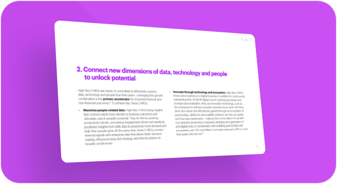 2.Connect new dimensions of data, technology and people to unlock potential High-Res CHROs are nearly 2x more likely to effectively connect • Innovate through technology and ecosystem: High-Res CHROs data, technology and people than their peers. Leveraging this growth know every business is a digital business. In addition to continuously combination is the primary accelerator for improved financial and reinventing their HCM/HR digital core to optimize processes and 14 non-financial outcomes. To achieve this, these CHROs: increase personalization, they use innovative technology, such as • Maximize people-related data: High-Res CHROs bring insights the metaverse to enhance people’s experiences at work. And they don’t do it alone: the efficiencies gained through an ecosystem of that connect talent more directly to business outcomes and partnerships, platforms and scalable solutions can free up capital ultimately unlock people’s potential. They do this by spotting and fuel new investments – making them a foundation for growth. productivity trends, uncovering engagement drivers and applying Our research shows that companies adopting next-generation AI predictive insights from skills data to proactively meet demand and and digital tools, in combination with enabling partnerships and help their people grow. At the same time, these CHROs connect ecosystems, are 2.6x more likely to increase revenue by 10% or more external signals with enterprise data that allows faster decision- 15 than peers who are not. making, influences long-term strategy and informs actions on broader social issues. 24