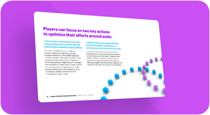 Players can focus on two key actions to optimize their efforts around scale. 1. Drive down costs faster than their 2. Obtain the technological abilities, revenue decrease to ensure that the such as intelligent automation, to volume/value tradeoff remains positive. process payments innovation at scale. This means establishing greater economies In our survey, 18 percent of respondents said that of scale in reaching enough new customers building security into the retail payments transaction at a pace necessary to justify further investment will be the main priority for banks; 22 percent cited in digital innovation and capture moments of scale artificial intelligence, robotics, machine learning and growth opportunities. Tactical examples of and innovative payments hubs as the key platform this include pursuing inorganic growth to increase technology capabilities that they need in adapting core scale and reduce unit costs, attracting new customers systems to high-speed and continuous payment flows. and revenue streams through new value-added services and playing the volume game on price by massively lowering remittance margins in exchange for higher volume. 10 GLOBAL PAYMENTS PULSE SURVEY 2019 TWO WAYS TO WIN IN PAYMENTS