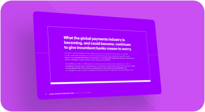 What the global payments industry is becoming, and could become, continues to give incumbent banks reason to worry. Market trends are converging on a future where payments are inevitably becoming instant, invisible and free (IIF). In this new payments world, how will incumbent banks add value and raise their game? What can they do now to reinvent themselves for IIF payments? How can banks both mitigate and capitalize on the upcoming payments disruption to grow customer loyalty, revenues and profitability? We recently posed these and other payments-related questions to 240 payments executives at banks from 22 countries. Drawing upon our deep experience in the payments industry and findings from the Accenture Global Payments Pulse Survey 2019, we see two complementary, interconnected and interdependent ways on how banks can use innovation to add value in the IIF payments world and win big: via scale and differentiation. 2 GLOBAL PAYMENTS PULSE SURVEY 2019 TWO WAYS TO WIN IN PAYMENTS