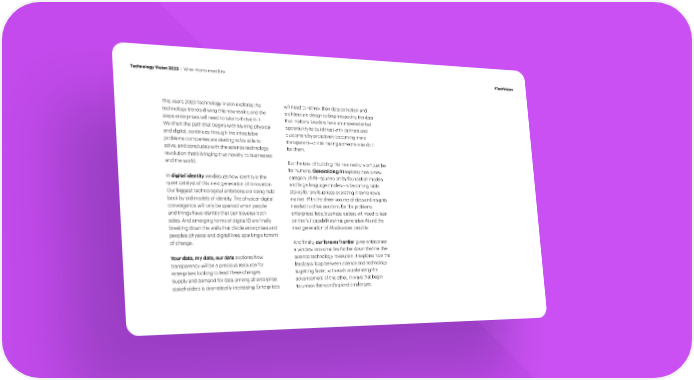 Technology Vision 2023 | When Atoms meet Bits #TechVision This year’s 2023 Technology Vision explores the will need to rethink their data collection and technology trends driving this new reality, and the architecture design to begin exposing the data steps enterprises will need to take to thrive in it. that matters. Leaders have an unprecedented We chart the path that begins with blurring physical opportunity to build trust with partners and and digital, continues through the intractable customers by proactively becoming more problems companies are starting to be able to transparent—or risk having someone else do it solve, and concludes with the science technology for them. revolution that’s bringing true novelty to businesses and the world. But the task of building this new reality won’t just be for humans. Generalizing AI explores how a new In digital identity we discuss how identity is the category of AI—spurred on by foundation models quiet catalyst of this next generation of innovation. and large language models—is becoming table Our biggest technological ambitions are being held stakes for any business operating in tomorrow’s back by old models of identity. The physical-digital market. With the sheer volume of data and insights convergence will only be sparked when people needed to drive solutions for the problems and things have identity that can traverse both enterprises face, business leaders will need to lean sides. And emerging forms of digital ID are 昀椀nally on the full capabilities that generative AI and the breaking down the walls that divide enterprises and next generation of AI advances provide. people’s physical and digital lives, sparking a torrent of change. And 昀椀nally, our forever frontier gives enterprises a window into what lies farther down the line: the Your data, my data, our data explores how science technology revolution. It explores how the transparency will be a precious resource for feedback loop between science and technology enterprises looking to lead these changes. is getting faster, with each accelerating the Supply and demand for data among all enterprise advancement of the other, in ways that begin stakeholders is dramatically increasing. Enterprises to unlock the world’s grand challenges.