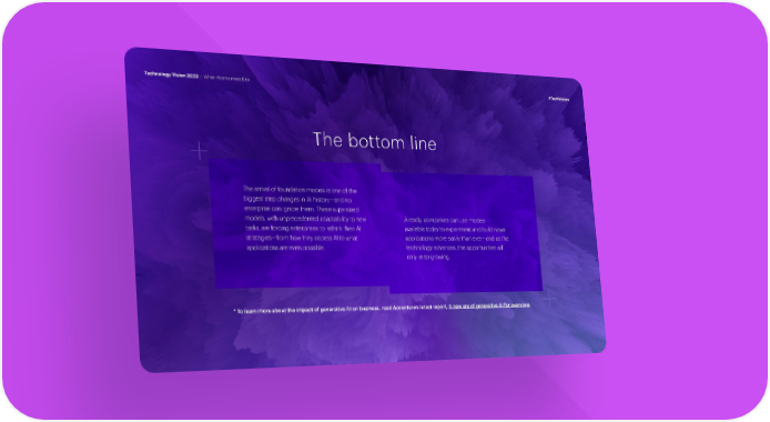 TTTechnology Vechnology Vechnology Vision 2ision 2ision 2023 023 023 | When A | When A | When Atttoms meet Bitsoms meet Bitsoms meet Bits #T#T#TechVechVechVisionisionision The bottom line The arrival of foundation models is one of the biggest step changes in AI history—and no enterprise can ignore them. These supersized models, with unprecedented adaptability to new Already, companies can use models tasks, are forcing enterprises to rethink their AI available today to experiment and build novel strategies—from how they access AI to what applications more easily than ever—and as the applications are even possible. technology advances, the opportunities will only keep growing. * To learn more about the impact of generative AI on business, read Accenture’s latest report, A new era of generative AI for everyone.