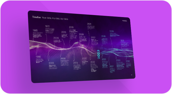 #TechVision Timeline Your data, my data, our data #TechVision 2021 A new record is set for the most successful 1972 2018 orbital launches in a year – 135105 NASA launches the first The U.S. Congress 2028 satellite of the Landsat passes the OPEN 1965 Program, an effort to Government Data Act A telecom company document the entire 2010 requiring federal demonstrates the ability to 96 agencies to publish Japanese clock company Earth from space An estimated 2 2020 wirelessly transmit 1 terabyte Yamasa creates the their data and of data per second first commercially zettabytes of metadata in an open, Snowflake, a cloud 2026 available pedometer data are created standardized and data warehousing 2022 100 (Manpo-kei)94 this year machine-readable company, goes public, A citizen hacking 2006 format101 raising $3.4B in the Nasdaq begins group publishes 2031 An estimated 161 largest software IPO requiring companies the salary and DEI exabytes of data are ever103 listed on its U.S. information of A national grocery chain is 98 exchange to publish most Fortune 500 able to facilitate 1-day created this year the diversity metrics companies recalls for produce thanks 107 of their boards to their supply-chain-wide traceability program 1966 Kelley Blue Book 2008 2020 publishes the first Glassdoor launches its An estimated 2025 New Car Price public beta version, 64.2 zettabytes California requires 2030 95 Manual 2005 offering transparency 2019 of data are 2022 new commercial The European Space 2032 into salary data and created this 680 financial buildings to put Agency (ESA) unveils new The amount of Yelp revamps its employee sentiment99 Zhamak Dehghani year104 institutions send temperature technology that tracks all data created this website and allows introduces the idea letters to the boards sensors in each orbital objects and year increases users to start sharing of a Data Mesh, a of 10,400 companies, room and report 2027 determines ownership. 300x over 2027 97 reviews of business new enterprise data asking them to aggregate data ESA plans to fine owners numbers architecture102 disclose The amount of of objects that violate environmental data created this deorbiting laws 106 year increases impact data 150x over 2022 numbers 42
