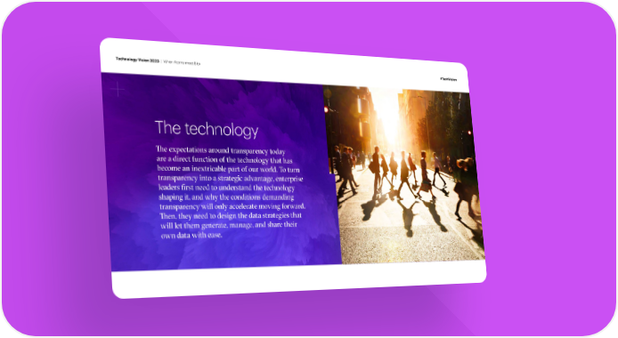 Technology Vision 2023 | When Atoms meet Bits #TechVision The technology e expectations around transparency today are a direct function of the technology that has become an inextricable part of our world. To turn transparency into a strategic advantage, enterprise leaders ‹rst need to understand the technology shaping it, and why the conditions demanding transparency will only accelerate moving forward. en, they need to design the data strategies that will let them generate, manage, and share their own data with ease.