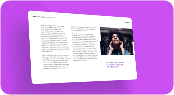 Technology Vision 2023 | When Atoms meet Bits #TechVision Spotify demonstrates another way to attract not take the helm, gathering and sharing information customers through information sharing. First within as well as beyond their walls, third parties can introduced in 2016, Spotify Wrapped is a and will meet that demand 昀椀rst. personalized summary of the music, artists, podcasts, and genres that a user listened to in This is a generation-de昀椀ning moment. We are 124 By packaging and presenting the past year. beginning a business era driven by transparency personalized data from an individual user back to rather than opacity. Enterprises are at the forefront them, it not only allows users to re昀氀ect on the year of changes radically reshaping the world, and being and learn about their listening habits, but it is also a leader in this next era will depend on trust—making designed to be shared on social media, sparking transparency your most precious resource. Yet engagement and surfacing content—with Spotify to succeed, your company’s data strategy—how at the center. In 2021, Spotify Wrapped received you create and collect, manage, and use your mentions in 1.2 million Twitter posts, and during the data—likely needs a reboot. You’ll need to look at week of its campaign, downloads of Spotify’s mobile your entire data lifecycle, rethinking what data you app increased 21%. collect and how you collect it, looking at your data management approach and how it might fall short, Lastly, you’ll need to update your branding strategy, and reassessing how you use data, who has access because once this kind of data exists you can’t to it, and what business functions you want from it. assume that it won’t get out to the public. Skeptical? It’s a big undertaking, but the bene昀椀ts that can be Most companies don’t publish salary information, gained are too big to pass up. but you can 昀椀nd it on Glassdoor. Want to know We are beginning a business who the biggest CO emitters are? Check out the 2 era driven by transparency, University of Massachusetts’s Greenhouse 100 Polluters Index. Increasingly, when companies do rather than opaci .
