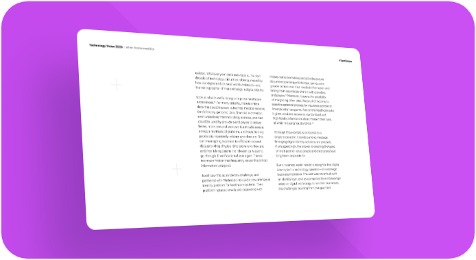 Technology Vision 2023 | When Atoms meet Bits #TechVision realized. Whatever your preferred vision is, the next mobile-native biometrics and provides secure decade of technology disruption is being shaped by document scanning and storage, giving users how our digital and physical worlds intersect—and greater control over their medical information and the very epicenter of that exchange is digital identity. letting them seamlessly share it with providers 53 and payers. Moreover, it opens the possibility Look at what b.well is doing to improve healthcare of integrating other data, like proof of income, to 52 For many patients, there is critical ease the approval process for insurance policies or experiences. data that could improve outcomes; medical records, 昀椀nancial relief programs. And on the healthcare side, family history, genomic data, 昀椀nancial information, it gives providers access to standardized and even wearables that track sleep, exercise, and diet high-昀椀delity information about those in their care, could be used by providers and payers to deliver 54 all while reducing fraud and risk. better, more personalized care. But this data exists across a multitude of platforms and hosts, forcing Although this example is contained to a patients to repeatedly validate who they are. This single ecosystem, it sends a strong message. Emerging digital identity solutions are precisely, can mean going in person to of昀椀ces to request data, providing physical ID to prove who they are, if unsuspectingly, the answer to creating the types and then taking data to the relevant party just to of multi-partner value people and enterprises have long been desperate for. go through ID veri昀椀cation all over again. There’s too much friction that frequently leaves this critical information untapped. Every business leader needs to recognize that digital identity isn’t a technology question—it’s a strategic b.well saw this as an identity challenge, and business imperative. The web was never built with partnered with Mastercard to build a new intelligent an identity layer, and as companies have increasingly identity platform for healthcare systems. Their relied on digital technology to run their businesses, platform replaces emails and passwords with the challenges resulting from that gap have