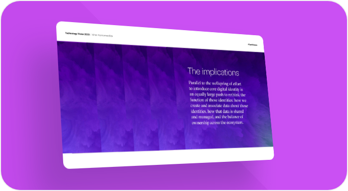 Technology Vision 2023 | When Atoms meet Bits #TechVision The implications Parallel to the wellspring of e†ort to introduce core digital identi is an equally large push to rethink the function of those identities: how we create and associate data about those identities, how that data is shared and managed, and the balance of ownership across the ecosystem.