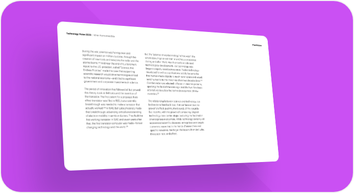 Technology Vision 2023 | When Atoms meet Bits #TechVision During the war, science was having clear and But the “science drives technology” ethos wasn’t the signi昀椀cant impact on military success, through the whole story. High investment in and focus on science creation of new tools and weapons like radar and the during and after World War II certainly accelerated 233 atomic bomb. And near the end of it, a landmark technological development—but technology also report to the U.S. president, called “Science, the began to rapidly accelerate science. Rocket technology Endless Frontier,” made the case that supporting developed for military applications quickly became the scienti昀椀c research would drive technologies critical 昀椀rst human-made objects to reach outer space and would 236 to the national economy—and it led to signi昀椀cant send humanity to the moon less than two decades later. government and corporate investments in science. Combat radar was adapted to focus on weather patterns, sparking the 昀椀eld of meteorology. And the hunt for cheap The period of innovation that followed all but proved alternatives to rubber led to the development of new this theory. Look at Bell Labs and the invention of materials.237 the transistor. The 昀椀rst patent for a proposed 昀椀eld- The relationship between science and technology is a effect transistor was 昀椀led in 1925, but a scienti昀椀c breakthrough was needed to make a transistor that bi-directional feedback loop that can be exercised to 234 actually worked. In 1946, Bell Labs physicists made powerful effect, pushing the bounds of the possible. that breakthrough, advancing critical understanding But recently, with the growth of computing, (digital) of electron mobility in semiconductors. They built the technology took center stage, capturing the fascination 昀椀rst working transistor in 1947, and seven years after of enterprises everywhere. While technology certainly still that, the 昀椀rst transistor computer was made—forever accelerated scienti昀椀c discovery, enterprises were largely changing technology and the world.235 content to leave that in the hands of researchers and speci昀椀c industries. We forgot the lessons from Bell Labs, the space race, and others.