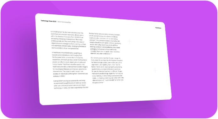 Technology Vision 2023 | When Atoms meet Bits #TechVision Is it challenging? Yes. But even at a time when the facilities for its barley upcycling company, EverGrain, world faces an uncertain economic climate and is which uses technology and science to 昀椀nd new still in the shadow of recovery from COVID-19, we applications for byproducts of the beer-making 4, 5 are seeing enterprises make some of their most process. The company created a new barley milk- ambitious bets yet. They are fueling a new wave of based coffee drink with Airship Coffee, is developing digital-physical convergence that’s pushing us closer snacks with barley-based ingredients with Post to a seamlessly shared reality—leveraging the best of Holdings, and even developed barley straw-based atoms and bits to drive novel possibilties. packaging for Corona, turning a traditionally discarded byproduct into paper board boxes that 6, 7, 8 In healthcare, this shared reality is pushing us take 90% less water to fabricate. towards personalized care. With funding from the European Union, a consortium of hospitals, But not everyone is ready for this step change. For researchers, and startups have joined the Neurotwin many years the guiding pillar of enterprise innovation project, an effort to build digital twins of individual has been taking processes, even whole parts of the 1, 2 human brains. Each twin would be used to help organization, and digitizing them—from how the healthcare providers understand and predict triggers factory 昀氀oor is run, to loyalty programs, advertising, for neurological diseases and improve preventative supply chains, and recently the entire workforce. interventions. The project is set to launch two For people, the story has been no different. People studies on individuals suffering from Alzheimer’s and have spent years building a digital life: from how we 3 epilepsy in 2023. do our banking, to establishing ourselves on social media, to choosing streaming over cable—which the Even problems as big as sustainability are being relative majority of TV watchers did for the 昀椀rst time re-examined through the lens of what we can do 9 this past summer. when we combine physical sciences and digital technology. In 2022, AB InBev expanded production