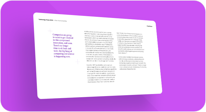 Technology Vision 2023 | When Atoms meet Bits #TechVision Another serious security issue for every business later” threats. One of these countermeasures is to stems from quantum computing. Shor’s algorithm protect the distribution of keys, and here, quantum Companies are going provides a quantum-theoretical solution to prime computing becomes our security ally. For example, to want to get involved factorization, which can break public-key encryption in early 2022, researchers from JPMorgan Chase, in this compressed that we rely on today. Quantum computers simply Toshiba, and Ciena demonstrated the full viability aren’t advanced enough yet to do so, but they’re of a Quantum Key Distribution (QKD) network, innovation, and soon. 292 getting there at a breakneck pace. While some supporting 800 Gbps data rates—showing that ere’s no longer believe quantum computers will break encryption under real-world environmental conditions, this time to sit back and in the next 10 to 20 years, the reality is that smaller, network could enable secure communications and wait, the big bang of more targeted attacks will happen soon, and successfully defend against quantum computing- companies will need to have plans to address this based attacks.293 computing and science in the next two years. Already, there are serious is happening now. concerns that hackers are collecting data now to As the positive feedback loop between science decrypt later once quantum computing is ready, also and technology accelerates, understanding both referred to as “store now, decrypt later” schemes. the risks and the opportunities ahead is critical. Companies are going to want to get involved in this compressed innovation, and soon. There’s no longer Currently, NIST has identi昀椀ed some quantum- resistant algorithms, but predictions on their viable time to sit back and wait, the big bang of computing lifecycle vary. What we know is that these algorithms and science is happening now. will not last 20 years and we have to be agile with cryptographic methods, ready to upgrade at any time. In the meantime, companies should prepare to transition to post-quantum cryptography and potentially invest in countermeasures to reduce the immediate threat from “store now, decrypt