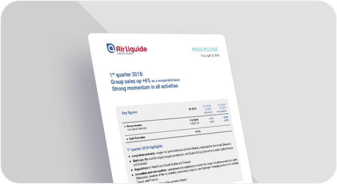 2 Q1 2018 Group revenue reached € 5,010 million, up +6,0% on a comparable basis . Gas & Services, Engineering & Construction, and Global Markets & Technologies contributed to this dynamic growth in a more favorable economic environment. This environment also had a positive impact on the Group’s Gas & Services 3 base business and on the activity of our customers, whose projects are more numerous. The level of growth st th for the 1 quarter follows an already solid rise in sales observed in the 4 quarter of 2017 (+4.5%). On a reported basis, Group revenue decreased -3.2% compared with Q1 2017 due to a strong negative currency impact (-8.2%), a scope effect (-0.7%), and a slightly negative energy impact (-0.3%). Gas & Services revenue totaled € 4,831 million for the first three months of the year, up +5.0% on a comparable basis, and down -4.3% as published compared with the same period in 2017, due primarily to the negative currency impact and a scope impact. On a comparable basis, all geographies progressed. The developing economies recorded sales growth of +10.7% for the 1st quarter of 2018. On a comparable basis, Gas & Services sales rose this quarter for all activities: ● Industrial Merchant sales grew +4.2%, with increases observed in all geographies, particularly the developing economies. In the Americas, demand was higher in all market segments and was particularly strong in the manufacturing sector. Airgas posted solid sales for packaged gases and hardgoods. In Europe, activity remained robust despite an unfavorable calendar effect. All countries contributed to growth and demand remained dynamic in Eastern Europe. In Asia, China’s growth continued at a pace surpassing +15%, with bulk and cylinder volumes up substantially, particularly for the automotive, metal fabrication, and research sectors. Australia returned to growth. The global price effect at +2.1% for the 1st quarter, has strengthened compared to the 4th quarter of 2017. ● Large Industries posted sales growth of +6.0%, well above the 4th quarter of 2017. Large Industries was experiencing a clear recovery in Europe, due in particular to sustained demand for hydrogen for the refining and petrochemicals industries, as well as solid cogeneration activity in Benelux. In the Americas, activity was driven by higher air gas sales in the United States and in Canada, and by the start-up of an oxygen production unit for a steelmaker in Argentina. In Asia, start-ups of air gas units in China and sustained demand for hydrogen in South Korea drove activity. High growth in the Middle East and Africa was attributable to the start-up of the world’s largest oxygen production unit in South Africa and the contribution of the Yanbu hydrogen production facility in Saudi Arabia, which is running at full capacity. st ● Electronics revenue grew +5.7% in the 1 quarter of 2018, driven by double-digit sales growth in Asia and high sales of equipment and installations globally. Asia benefited from start-ups and ramp-ups of carrier gas production units in China and in Japan, and from demand for advanced materials which remains strong. ● Healthcare sales remained solid, increasing by +4.9%. All regions posted growth in this quarter, and activity was particularly dynamic for the developing economies, most notably in South America. Home healthcare continued to grow and demand for home diabetes care remains strong. Growth was also driven by strong demand for specialty ingredients developed for the cosmetics industry. The Group continued its strategy of targeted acquisitions with two new acquisitions, in France and in Saudi Arabia. After several challenging quarters and stabilization in the 4th quarter of 2017, Engineering & Construction sales st resumed growth in the 1 quarter of 2018, reaching € 85 million. The quarter saw further improvement in order intake. 2 Comparable change: excluding currency, energy, and significant scope impacts. 3 Comparable change excluding the contribution of startups, ramp-ups, and small acquisitions. www.airliquide.com Follow us on Twitter @airliquidegroup
